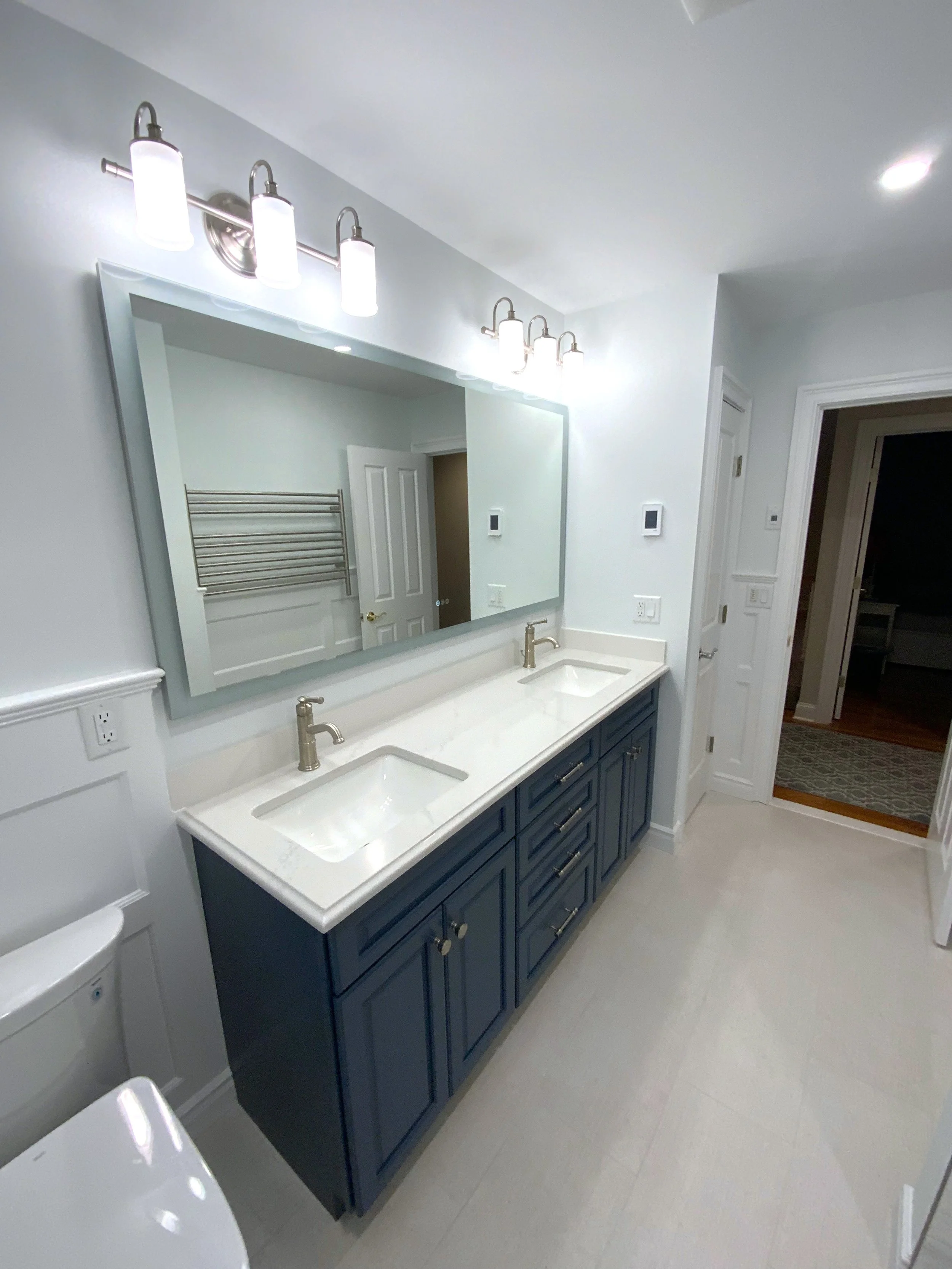 In the primary bath we installed updated his and hers vanities and cabinets, allowing for more storage and functionality. The custom tile walk-in shower included a corner bench, built in wall niches, and new glass doors. However we have to say real stand outs in this space are the free standing soaking tub and beautiful bouquet style chandelier in this unique vaulted ceiling. Custom touches really made this project. The secondary bath got a full makeover including an updated walk-in shower & double vanity, new tile, lighting, and finishes. In both bathrooms we installed radiant heat flooring, towel warmers, hot water recirculators, and custom wainscot wall paneling. Our team worked closely with the homeowners to bring their vision of these spaces to life, and our clients choice of materials and finishes were the magic touch to a great project.