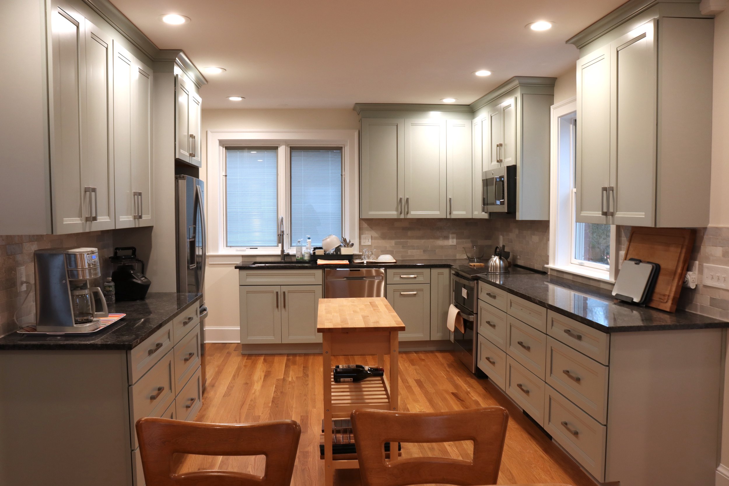 Our designers sat down with these repeat clients to reconfigure and add on to their home to create additional and more functional space. The final design included removing a wall to expand the kitchen and open it up to the dining room and living room, adding on to the existing footprint to incorporate a powder room and mudroom with closet into the first floor living space, and replicating the existing archway to tie the new space in with the existing. We installed Pella windows in the kitchen and addition, KraftMaid cabinets in the kitchen and baths, installed or refinished the hardwood floors and put a fresh coat of paint throughout the first floor.