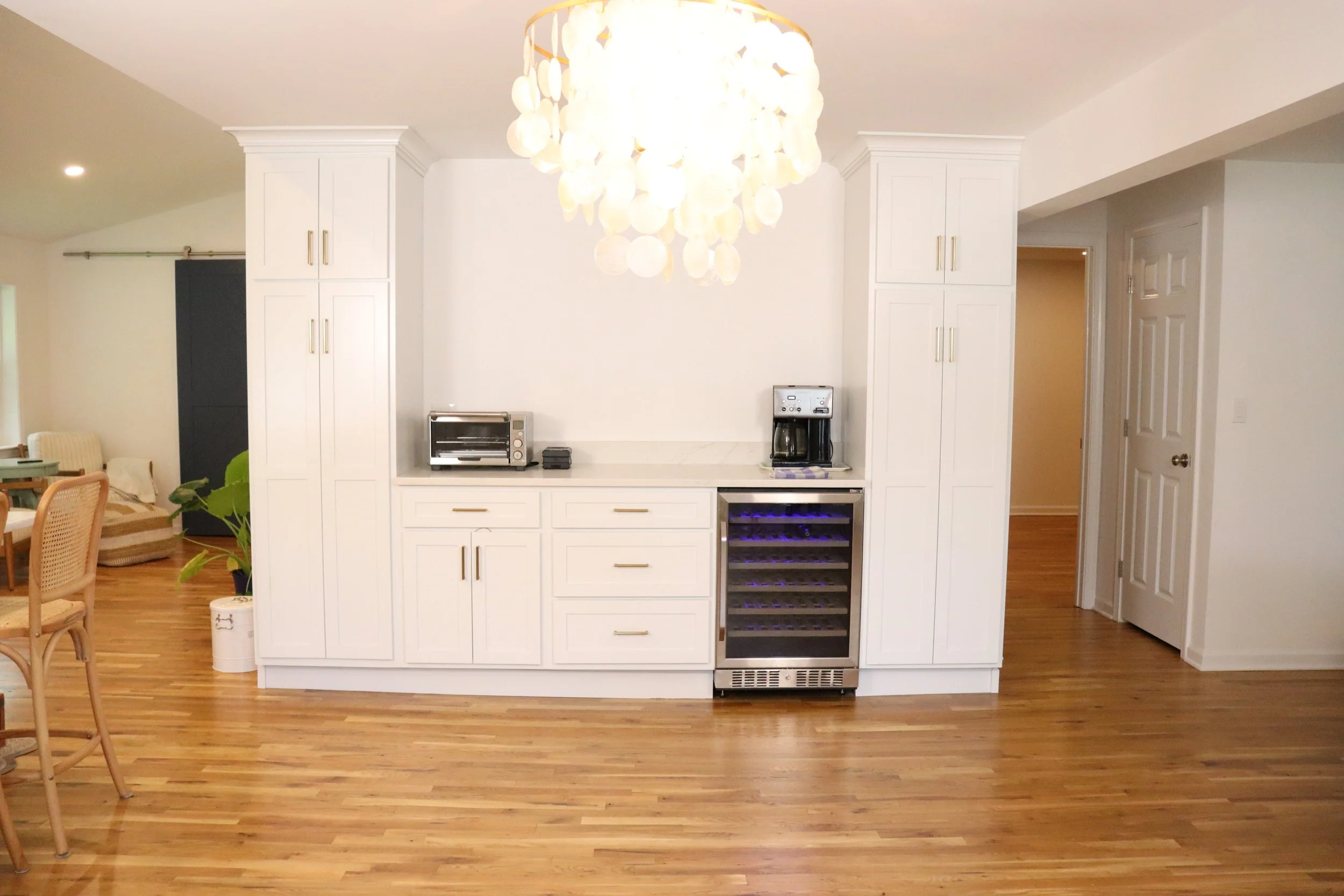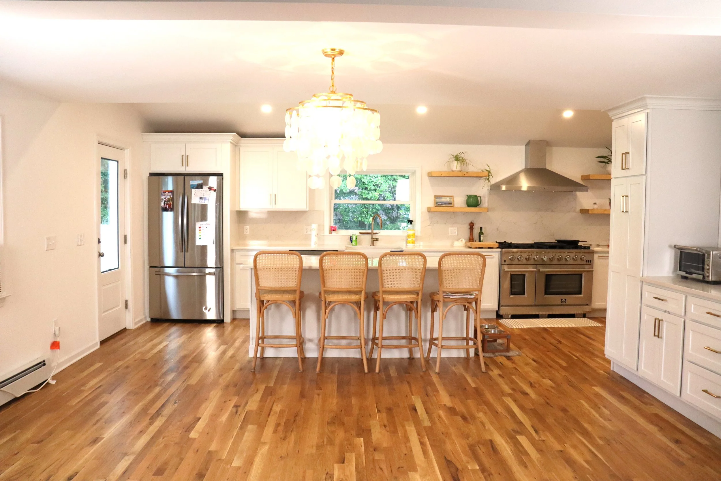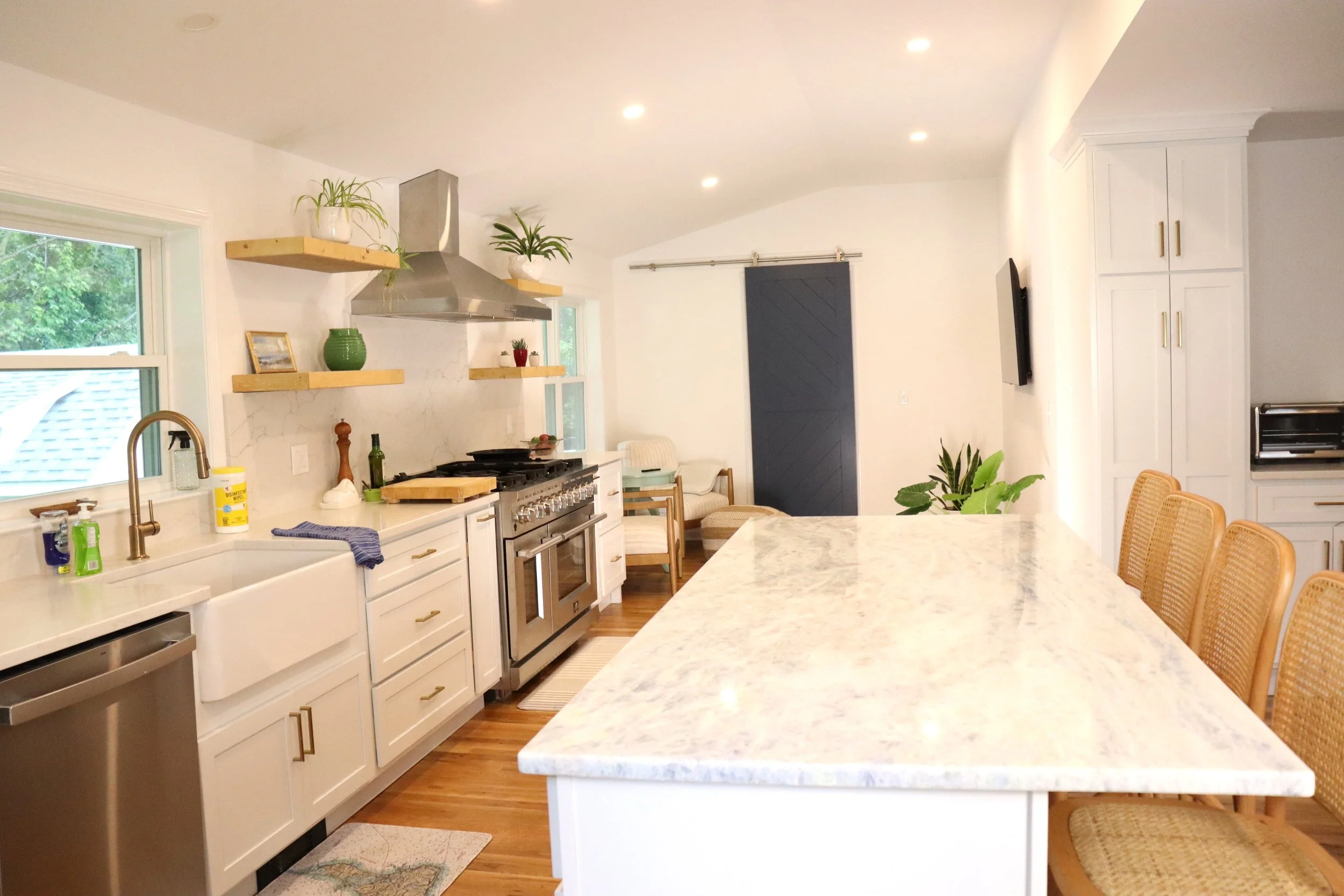 Here you can see a project we recently completed in Milford, CT. Our designers worked with the homeowners to create an open floor plan and an updated look flowing from the kitchen through the entire first floor to the new master suite. After converting the kitchen ceiling to a vaulted ceiling, we installed new windows and doors, including a custom barn door, white cabinets and wooden floating shelves, stainless steel appliances, hardwood floors, and quartz countertops on the island, counters, and beverage center as well as quartz backsplash to complete the kitchen and dining area, which along with the living room are now one large space. Going into the living room you will see the newly opened stair wall with a modern nautical style cable railing system the homeowners selected, as well as fresh trim work throughout. Heading down the hall, first you come to the new powder room with a custom herringbone tile floor pattern and vibrant wallpaper. Moving on to the master suite you'll see the hardwood flooring continues and another custom barn door, beautiful tilework, frameless glass door, and bright finishes in the master bathroom, and an oversized walk-in closet for loads of storage. All throughout this home the lovely finishes tie the design together for a sophisticated beachfront feel.