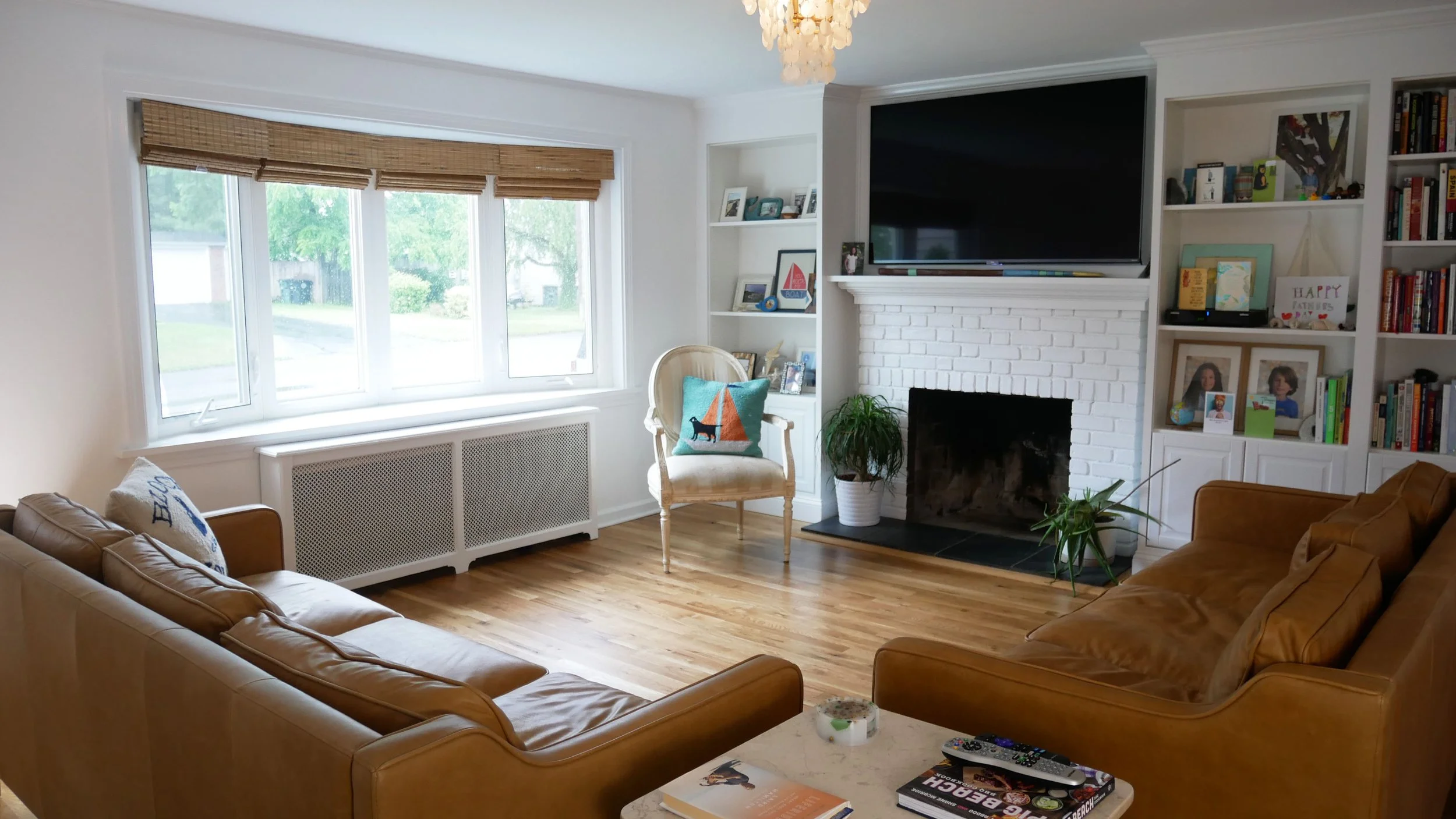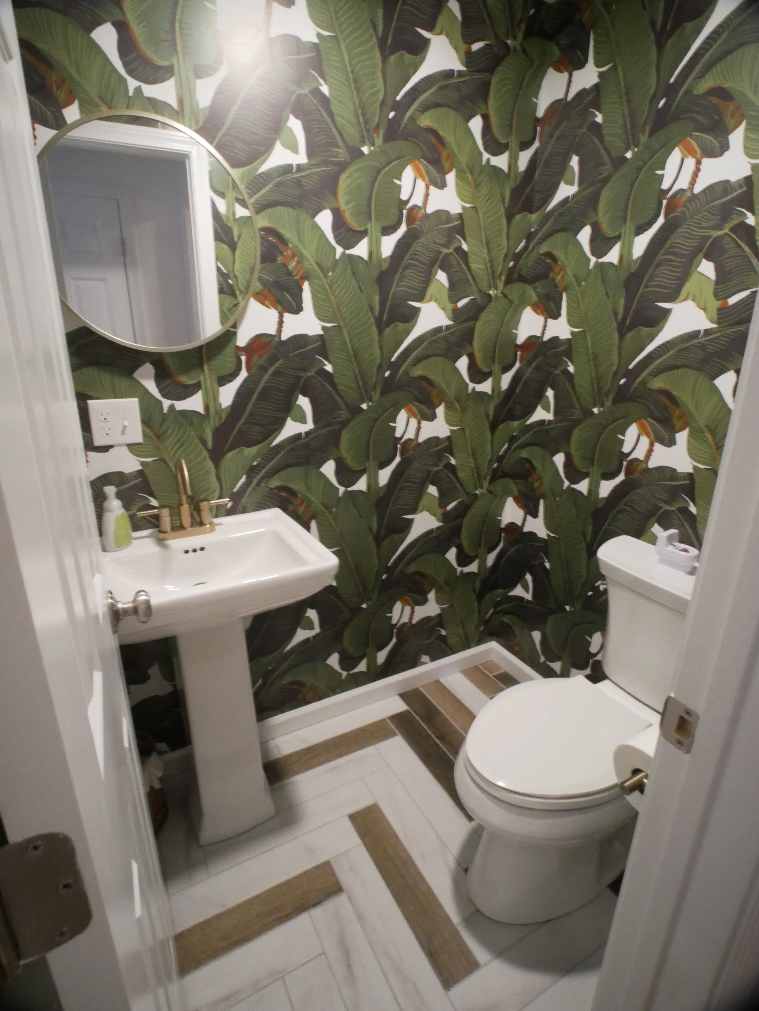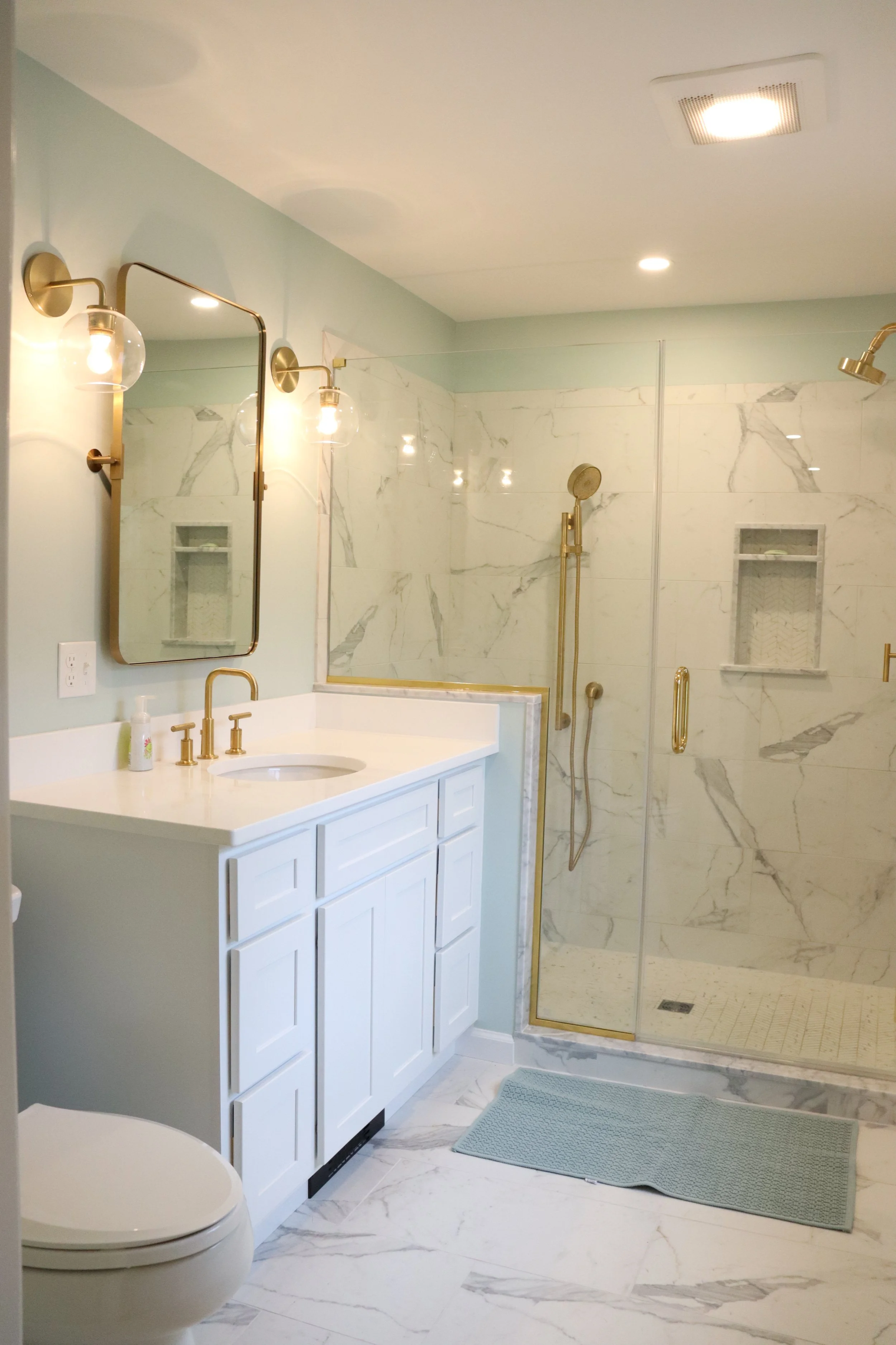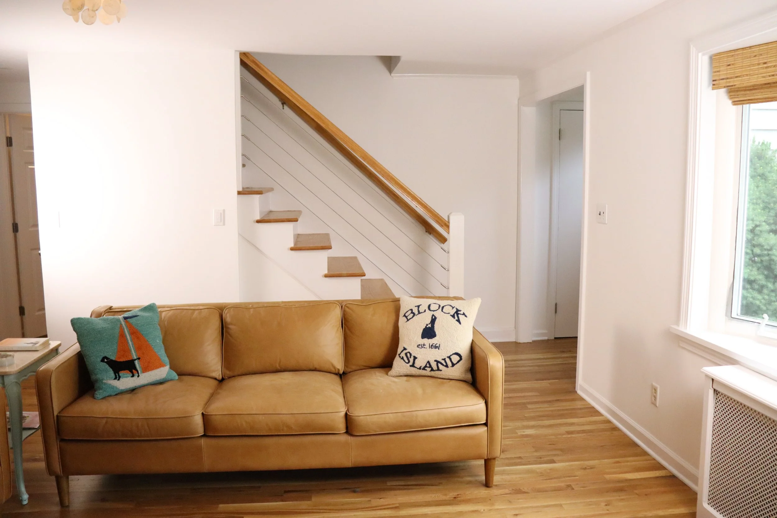 Here you can see a project we recently completed in Milford, CT. Our designers worked with the homeowners to create an open floor plan and an updated look flowing from the kitchen through the entire first floor to the new master suite. After converting the kitchen ceiling to a vaulted ceiling, we installed new windows and doors, including a custom barn door, white cabinets and wooden floating shelves, stainless steel appliances, hardwood floors, and quartz countertops on the island, counters, and beverage center as well as quartz backsplash to complete the kitchen and dining area, which along with the living room are now one large space. Going into the living room you will see the newly opened stair wall with a modern nautical style cable railing system the homeowners selected, as well as fresh trim work throughout. Heading down the hall, first you come to the new powder room with a custom herringbone tile floor pattern and vibrant wallpaper. Moving on to the master suite you'll see the hardwood flooring continues and another custom barn door, beautiful tilework, frameless glass door, and bright finishes in the master bathroom, and an oversized walk-in closet for loads of storage. All throughout this home the lovely finishes tie the design together for a sophisticated beachfront feel.