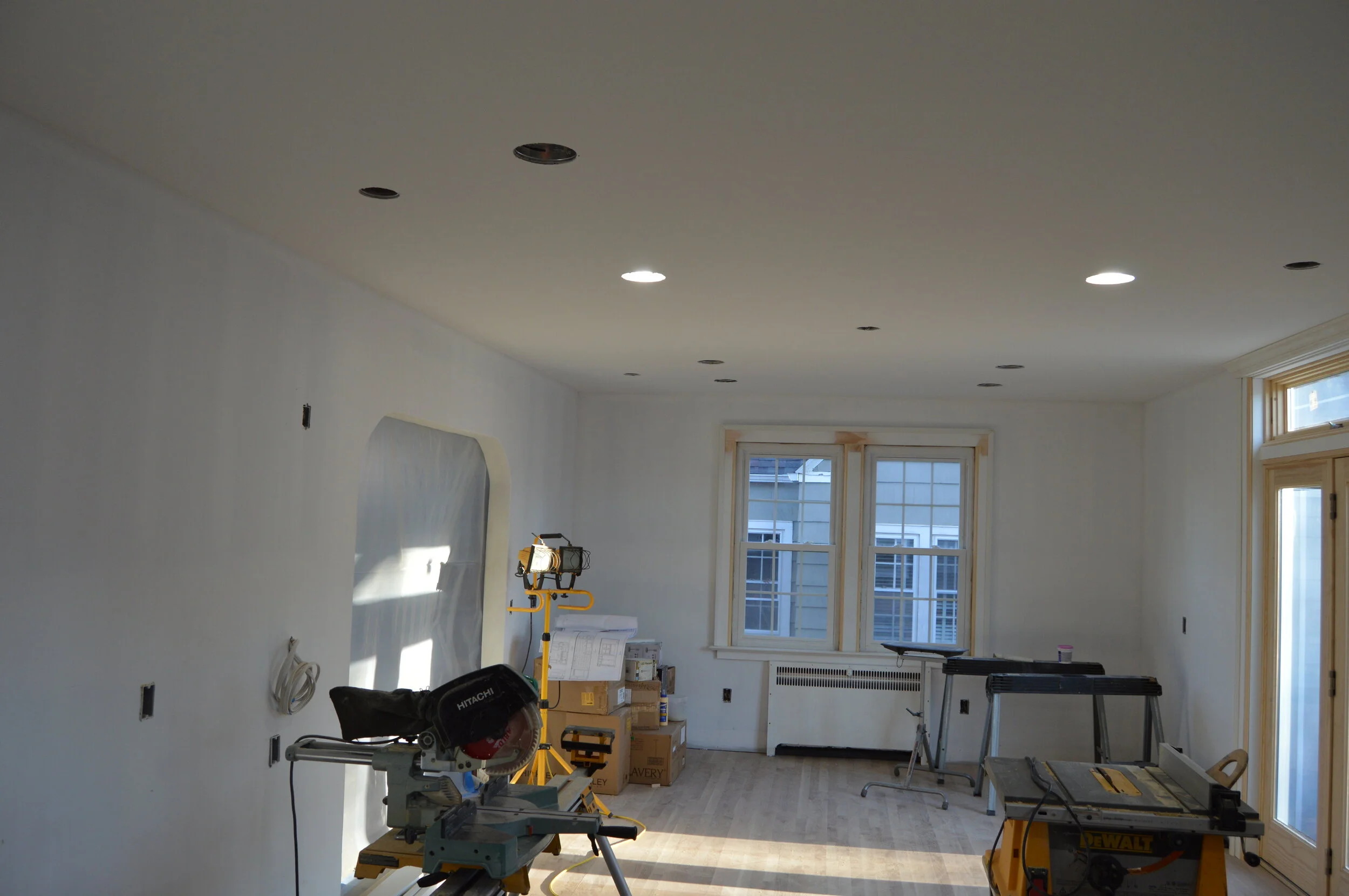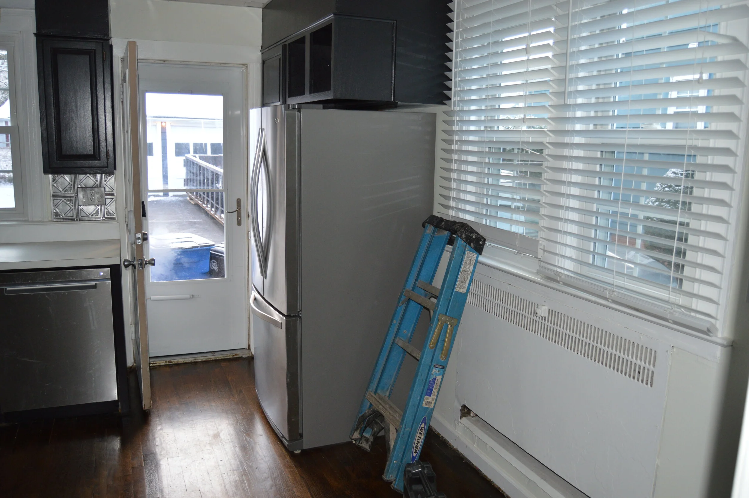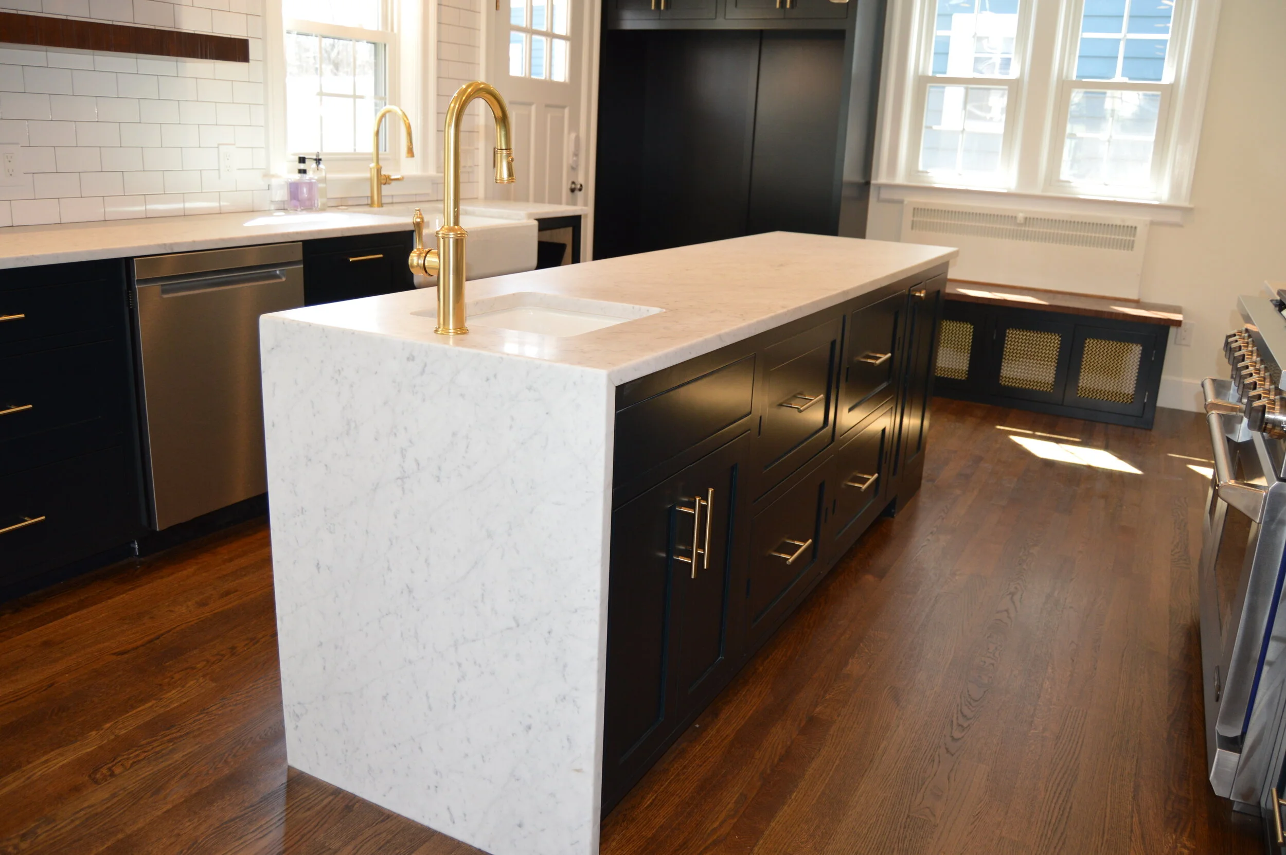 Featured in Dwell Magazine, these homeowners and their designer, Jonathan from Design by the Jonathans, put together this amazing kitchen design with custom cabinets and quartz countertops with a waterfall on the island along with fantastic finishes and fixtures to tie the look together. To start this project, we completely gutted the kitchen and dining room, exposing the walls and ceiling in the entire back of the house back to studs and the floors down to the joists. From here we reframed the ceiling and walls to get level and plumb, replaced the sub flooring to allow new hardwood floor to match existing, removed windows, framed out and installed a 5 foot French door with operable transom window, and installed a new exterior door. In addition to the new walls, ceilings, and hardwood floors, you can see the custom trim work, subway tiles floor to ceiling on two walls, recessed and pendant lights, brass fixtures for sink, prep sink, and pot filler, floating shelves for storage, a custom bench near rear entry door, and original radiator covers that have been rejuvenated by sand blasting and powder coating.