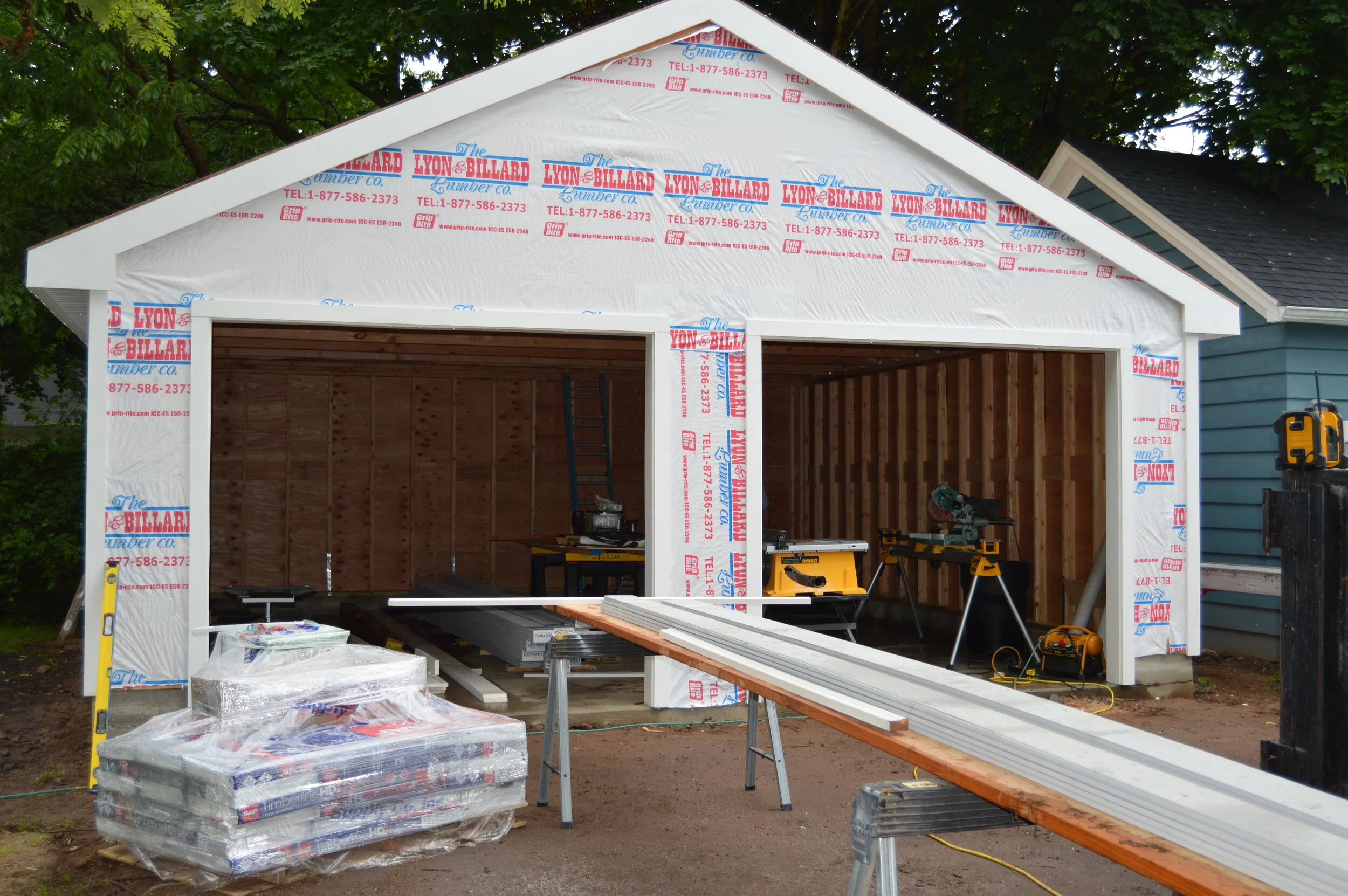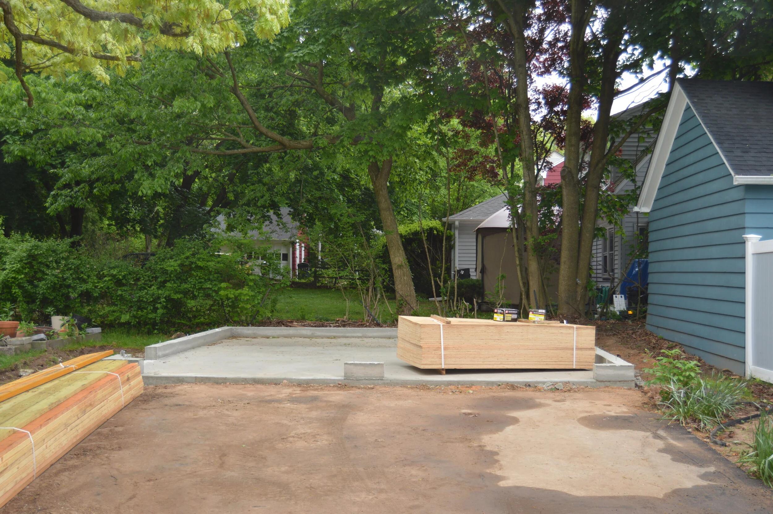 While this was going on inside, there was more work happening outside. We demolished the existing garage and built a new one in its place. We replaced the old covered landing with a new one and also built a new landing for the newly installed French doors, using Ipe decking and PVC trim for both. We installed new exterior lighting, a new patio, and finished it off with a new asphalt driveway.